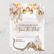 Une merveilleuse et vibrante illustration présentant de belles plumes en macramé suspendues derrière des guirlandes lumineuses scintillantes et des lanternes suspendues. Un magnifique gâteau de mariage blanc orné d'orchidées et de fleurs d'anémone repose derrière de vieilles branches en bois sur lesquelles reposent des lanternes en osier et une bougie dans une lanterne. Ceux-ci sont idéaux pour les faire-part "save the date" rustiques de campagne pour l'automne, l'été, le printemps, le safari africain en brousse ou l'hiver. Ces cartes plates luxueuses et élégantes raviront vos invités.