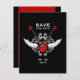 Annoncez votre mariage avec cette carte Save the Date non conventionnelle en style rock et roll avec des guitares électriques croisées, des ailes et des ornements vintages en noir. Personnalisez-le avec vos propres informations ou customisez-le davantage si vous avez besoin de modifier la disposition, les couleurs, le texte ou la taille de l'invitation.