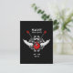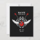 Annoncez votre mariage avec cette carte de sauvegarde de date non conventionnelle dans le style rock and roll avec des guitares électriques rouges croisées, des ailes et des ornements vintage sur fond noir.
