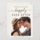 Faire-part mariage moderne crème pâle. Le recto présente votre photo, "Save The Date For Our Happily Ever After" dans un mélange de typographie simple et d'un script chic avec des swashes et vos prénoms et date de mariage réunis par un coeur. Au contraire, personnalisez votre enregistrement des détails de la date et ajoutez vos noms dans un script de type signature.