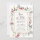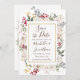 Hiver et Noël Save the Date dépeint un cadre doré entouré d'un design d'aquarelle fleurie élégant comprenant des roses blanches, des baies rouges, des brindilles rustiques et de la verdure. Le dos présente une citation mariage inspirante, "Deux vies unies dans l'amitié, Deux amis unis dans l'amour, Un amour uni dans le Christ."