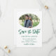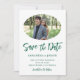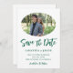 Une photo ovale sur votre sauvegarde des dates. La couleur verte du chasseur de la police de caractères du script "Save the Date" de style manuel et d'autres textes peuvent être customisés. Texte vert foncé contre blanc.
