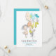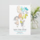 Une illustration adorable d'un garçon debout avec ses mains derrière le dos tenant un bouquet de fleurs et un ballon qui dit "l'amour dans l'air" dans des nuances de rose pastel, bleu, orange et jaune. Il regarde une fille portant une robe rose debout avec la tête penchée de côté de manière aguichante. Ils sont amoureux et sont debout au-dessus de modèles en gris ultime et bleu aqua qui peuvent être personnalisés avec vos détails de "save the date". Le fond bleu sarcelle aqua à l'arrière peut être changé en n'importe quelle couleur de votre choix. Des informations supplémentaires peuvent être ajoutées au dos de la carte.
