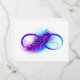 Infinity symbole with a beautiful feather painted in purple and blue bright colors on white background