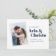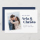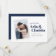 Un décontracté et moderne enregistrer la conception de la date avec une photo verticale avec une bordure d'instantané blanc, placé en diagonale avec vos détails mariages à côté en bleu marine serif moderne et écriture manuscrite.