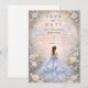 Cette conception élégante de quinceañera présente un fond d'aquarelle bleu poudre doux encadré par de délicates roses ivoire, une verdure subtile et des détails dorés ornés, avec une illustration de robe gracieuse créant une atmosphère raffinée et inspirée des contes de fées. La palette bleue fraîche associée à des fleurs romantiques donne au design une sensation intemporelle et luxueuse, parfaite pour une célébration classique de quinceañera avec un style de jardin élégant.