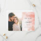 This wedding save the date card features a split layout with a warm, intimate photo on one side and elegant text on the other. The color palette includes soft peach, pink, and cream tones, creating a romantic atmosphere. The design combines modern typography with a watercolor background for a contemporary yet timeless look. Perfect for setting the tone for a memorable celebration, this card conveys joy and anticipation through its gentle textures and harmonious composition.