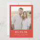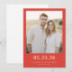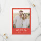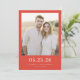 This wedding save the date features a warm, intimate photograph of two individuals standing close together in an outdoor setting with soft, natural lighting. The design is framed by a bold red border that contrasts beautifully with the earthy tones of the image. At the bottom, elegant serif typography presents customizable text for the date and location, adding a classic touch to the overall layout. The mood is joyful and celebratory, perfect for announcing a special occasion with style and simplicity.