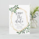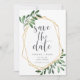 Beau mariage vert et or enregistrer les cartes de datation sont des lettres grises encadrées par une bordure géométrique en faux or et le feuillage couleur vert chasseur foncé, feuilles et baies blanches. Personnalisez avec vos noms, votre date de mariage et votre emplacement, et ajoutez des informations supplémentaires, comme votre site Web mariage, au verso. Un choix moderne dans une palette de couleurs naturelles pour les mariages à thème boho, boisé ou nature en toute saison.