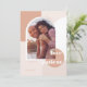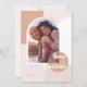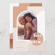 Photo tendance et moderne enregistrer la conception de la carte de date. L'or rose moderne, le bleu et la palette de couleurs bronzées créent un look moderne et élégant. "L'amour est patient" couplé à la calligraphie à lettrage manuel moderne. Aménagement géométrique tendance avec cadre photo voûté pour afficher votre photo spéciale. L'envers présente un design géométrique moderne et audacieux.