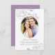 Cette carte Save the Date présente une belle conception avec votre photo dans un cadre ovale entouré de lavande ou de lettres violettes légères sur un arrière - plan blanc, et frileusement faux feuille argent gris dans les coins. Il y a de la place pour le nom du couple, l'emplacement du mariage et le site Web. Une façon élégante et chic de faire savoir à vos amis et à votre famille de sauver la date pour votre jour spécial.