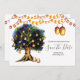 Une illustration merveilleuse et vibrante représentant un grand chêne rempli de lanternes suspendues faussement brillantes et de guirlandes lumineuses sur fond blanc. Celles-ci sont idéales pour les annonces "save the date" de campagne rustique pour l'automne, l'été, le printemps ou l'hiver. Ces cartes plates luxueuses et élégantes raviront vos invités.