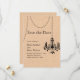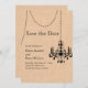Un beau lustre sur un arrière - plan burlap donne le ton de cette Save the Date et de l'événement à anticiper. Il est montré sur le papier de base; cependant, je recommande le poids et la texture du papier de lin pour améliorer la sensation de burlap. Ceci fait partie de la collection mariage complète Chandelier sur Burlap.