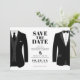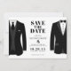 Faites savoir à tout le monde que vous avez fixé une date pour votre mariage avec cette carte moderne d'épargnez la date avec deux costumes noirs. Personnalisez en ajoutant vos noms, date et lieu de mariage.