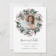 Élégant botanique enregistrer les dattes disposent d'une photo fiançailles préférée entourée d'une couronne ronde de fleurs de magnolia rose et d'eucalyptus feuilles dans une élégante palette d'aquarelles rose et vert. Carte inversée dans un gris argenté riche et clair avec des fleurs coordonnées. Personnalisez avec vos noms, date mariage et emplacement. D'autres couleurs sont disponibles