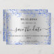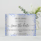 Un moderne et élégant Save the Date pour un mariage. Un arrière - plan faux argent décoré de parties scintillant bleue royale. brille. Personnalisez et ajoutez une date et des noms. Le texte : Save the Date est écrit avec un grand script de style à la main tendance.