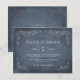 Une élégante invitation à réserver la date avec un fond ardoise bleu poussiéreux encadré par une délicate vigne et une bordure de grappes de raisin — idéal pour les mariages dans les vignobles ou les régions viticoles. La typographie mixte raffinée en blanc argenté doux complète l'aspect sophistiqué. Tous les noms, dates, lieux et détails du site web sont entièrement personnalisables.
