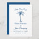 Demandez à vos invités d'enregistrer votre date de mariage avec ce design simple et élégant, avec un script moderne, du texte bleu et un palmier artistique. Customisez-le avec votre date mariage, vos noms et votre emplacement.