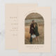 Une simple et élégante carte de save the date de mariage en beige, conçue avec une arche au milieu et des lettres cursives au dos. Personnalisez avec les détails de votre mariage futur sur le recto et le verso de la carte.