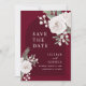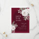 Magnifiques fleurs et feuillages blancs, sur un fond bordeaux riche, dans un design minimaliste... avec les détails de votre événement en écriture moderne et police classique, à l'intérieur d'une arche bordeaux plus profonde. Simple. Élégant. Parfait pour un mariage d'hiver.