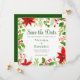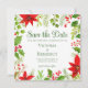 Ce mariage de Noël vert classique Enregistrer la carte Date présente des fleurs poinsettia vives en bas à droite de votre invitation et des baies saintes rouges et de la verdure en haut à gauche. Une invitation botanique festive et lumineuse pour un mariage de vacances au script vert.