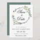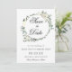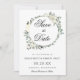 Un design floral élégant et intemporel présente des fleurs blanches rosées et des feuilles vert foncé. Ensemble, ils créent une couronne qui entoure les mots Enregistrez la date. Vos noms, date et lieu de mariage suivent. Enregistrez la date est écrit dans une belle police de caractères traditionnelle. La même police est utilisée pour l'invitation formelle à suivre. Tout le texte est modifiable. Cet article est coordonné avec la collection Together.