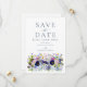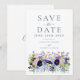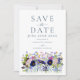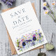 Faire-peinture à l'aquarelle de fleurs sauvages et de feuillage, invitation de mariage "save the date" dans des tons de bleu marine, bleu poussiéreux, bleuet, bleu marine, violet, rose, jaune, bordeaux, magenta et vert. Personnalisez les initiales du monogramme de la mariée et du marié au dos de l'invitation. Idéal pour une invitation de mariage "save the date" unique pour un mariage de printemps ou d'été. La typographie moderne élégante en bleu marine complète l'œuvre d'art bohème fantaisiste qui comprend des bleuets, des pavots, des cosmos, des myosotis, des marguerites, des boutons de billy et un feuillage délicat. Invitations de mariage bohème chic "save the date" parfaites pour un mariage dans une prairie printanière ou un jardin d'été. Œuvre originale de l'artiste Catherine