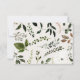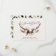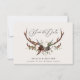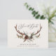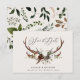 Carte de mariage avec feuillage rustique, fleurs et bois de cerf. Avec de beaux feuillages aquarelle, fleurs blanches, rondelle de bois et écriture manuscrite. Cette invitation moderne est sûre de définir le style de votre fête à venir.