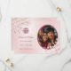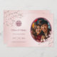 Cette carte Save the date comporte de belles fleurs de cerisiers roses poussiéreuses, un symbole de bonheur double mauve et une photo personnalisée. Le texte à l'arrière a un double symbole de bonheur pâle dans l'arrière - plan.