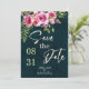 Carton d'invitation de mariage classique émeraude vert, bordeaux et rose blush avec des roses florales rustiques sur un thème de conte de fées sombre et lunatique, carte de sauvegarde de la date