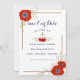 Le design de Nautical Boutique Co., rouge, blanc et bleu Save the Date, présente de belles fleurs d'anémone rouge aquarelle avec des centres bleus, une bordure de corde nautique, et ancre et pièce centrale florale assortie. La typographie de script moderne est jumelée à une police de bloc traditionnelle, donnant à ce design un style haut de gamme. L'envers est bleu marine avec des fleurs d'anémones rouges surdimensionnées. #Nautical #Anemone #SaveTheDate
