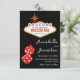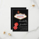 Cette invitation de mariage personnalisée pour la date de sauvegarde comporte un thème de casino de Las Vegas sur un fond noir. Le classique panneau de bienvenue à Las Vegas est imprimé en haut avec un exemple de texte que vous pouvez personnaliser. Une paire de dés scintillants rouges est imprimée en bas, Les noms des mariés et la date du mariage sont imprimés à droite des dés dans une élégante police noire.