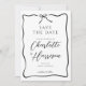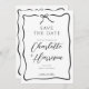 Un simple script manuscrit moderne minimaliste noir et blanc mariage de typographie enregistrer le faire-part de date, encadré d'un cadre ruban ondulé avec arc dans un style dessiné à la main. Style de coquette fantaisiste informel. Disponible en version imprimée, en téléchargement numérique ou les deux.