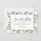 Ce beau mariage, sauf la carte date a une photo verticale contre un cadre d'aquarelle feuilles eucalyptus. Les mots en dessous de la photo disent Enregistrer la Date avec de l'espace pour la date du mariage. Au verso de la carte vous pouvez ajouter vos noms, la date du mariage et l'emplacement de votre mariage.