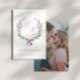 Un mariage élégant, à l'exception de l'annonce de la date avec des fleurs de lavande d'aquarelle et une couronne de fer à cheval feuille finie avec joli arc coquette. Votre monogramme est en caractères lilas traditionnels script et date mariage en gris serif au centre. Personnalisez encore plus avec vos noms, l'emplacement du mariage et la photo au verso.