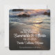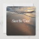Carte de sauvegarde de mariage de destination côtier aux vagues de plage avec une photo de coucher de soleil des vagues qui se brisent sur le sable. Un beau design moderne de papeterie de mariage de destination pour avertir vos amis et votre famille de vos plans de mariage spéciaux.