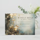 La brume et les arbres de la forêt éthérée avec les lanternes en forme de champignon suspendues présentées dans ce mariage sauvent la date faire-part, dans les teintes de forêt gris foncé, et la brume. Ethérée et mystique.