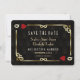 Unique Casino Royale et Great Gatsby conception de carte à thème. Il présente un style art déco vintage, un cadre rompu de Roaring des années 1920 avec fausse feuille d'or Fleur-de-lis, coeurs rouges, Q et Q sur deux coins (simulant les cartes à jouer). Sur le dos faux motif Art Déco or, initiales et combinaisons de cartes. Utilisez l'outil Personnaliser pour ajouter vos informations. Pour plus d'informations, visitez s'il vous plaît, ma Collection de Casino Gatsby.