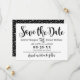 Le mariage moderne enregistrer les cartes de faire-part date dispose d'un modèle moderne de couleur noir et blanc avec audacieux et ludique calligraphie manuscrite typographie avec des détails de défilement élégant. Personnalisez le texte personnalisé décontracté mais élégant avec les noms de la mariée et du marié et les détails du mariage. Comprend un motif à pois contrasté amusant à l'arrière.