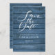 Ce rustique enregistrer la carte date dispose d'un script élégant enregistrer la date au-dessus de vos détails set dans la typographie élégante sur un arrière - plan rustique de panneaux de bois bleu. Conçu par Thisisnotme©