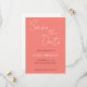 Cartes de faire-part de mariage de style simple qui présentent une écriture stylisée blanche sur un fond de couleur corail tendance. Modifiez et remplacez les noms, la date et le lieu par les vôtres. Sélectionnez la taille de votre invitation et le style de papier.
