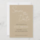 Cartes de faire-part de mariage de style simple qui présentent un écriture stylisée blanche sur un fond de couleur kaki tendance. Modifiez et remplacez les noms, la date et le lieu par les vôtres. Sélectionnez la taille de votre invitation et le style de papier.