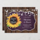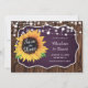 Mariage rustique violet enregistrez la carte de date avec un tournesol et des lampes à cordes contre un arrière - plan rustique en bois. Un design de carte parfait pour une fête mariage de automne rustique.