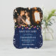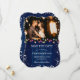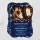 Photo de mariage bleu marine de vacances enregistrer la date avec les lumières de Noël et les flocons de neige sur un arrière - plan rustique en bois. Personnalisez facilement cet hiver enregistrer la date avec votre photo et les détails du mariage.