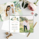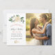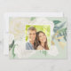 La carte de sauvegarde de mariage comprend deux photos de fiançailles avec un design floral aquarelle "Sauver notre date" avec des fleurs et de la verdure à l'avant et à l'arrière. Les couleurs comprennent un fond vert doux (pouvant être personnalisé) avec un blanc printanier neutre, de la crème, rose blush, or et vert.