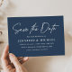 Enregistrez simplement la carte de date avec "Save the Date" dans un script manuscrit blanc avec un arrière - plan denim/marine. Personnalisez le moderne enregistrer la carte de date en ajoutant vos noms, date mariage, emplacement du mariage, site Web mariage, etc. Le minimaliste enregistrer la carte de date inverse pour afficher un arrière - plan de marine solide avec de l'espace pour du texte et des photos supplémentaires.