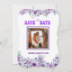 Ce magnifique faire-part mariage "Save the Date" dispose d'un couple romantique embrassant la plage au coucher du soleil. Entourée d'élégantes bordures de lavande et de fleurs violettes, l'image est encadrée d'un violet saisissant, rehaussant la chaleur et l'intimité du moment du couple. Les invités faire-part à marquer leur calendrier pour une fête mariage le samedi 8 août 20XX. Un savant mélange de romantisme et de style, idéal pour les mariages à la plage ou à thème floral.