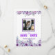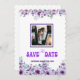 Ce magnifique faire-part mariage "Save the Date" dispose d'un couple romantique embrassant la plage au coucher du soleil. Entourée d'élégantes bordures de lavande et de fleurs violettes, l'image est encadrée d'un violet saisissant, rehaussant la chaleur et l'intimité du moment du couple. Les invités faire-part à marquer leur calendrier pour une fête mariage le samedi 8 août 20XX. Un savant mélange de romantisme et de style, idéal pour les mariages à la plage ou à thème floral.