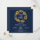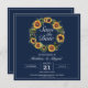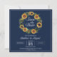 Faire-part de mariage élégant avec une belle couronne de tournesols et un fond bleu marine. Personnalisez-le avec un QR code au dos que vos invités pourront scanner pour ouvrir facilement votre site web de mariage.
