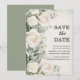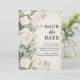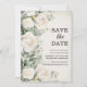 Élégant botanique, carte de Save the Date mariage floral aquarelle avec des roses blanches et de la verdure. Cette carte Save the Date est une carte sans photo. Contactez-moi pour obtenir de l'aide pour vos personnalisations ou pour demander des produits Zazzle supplémentaires correspondants ou coordonnés.